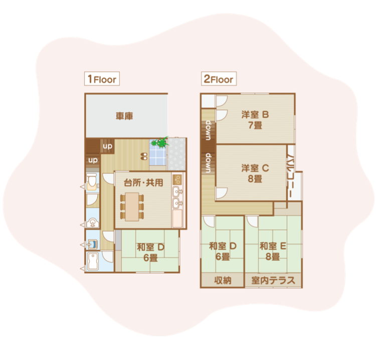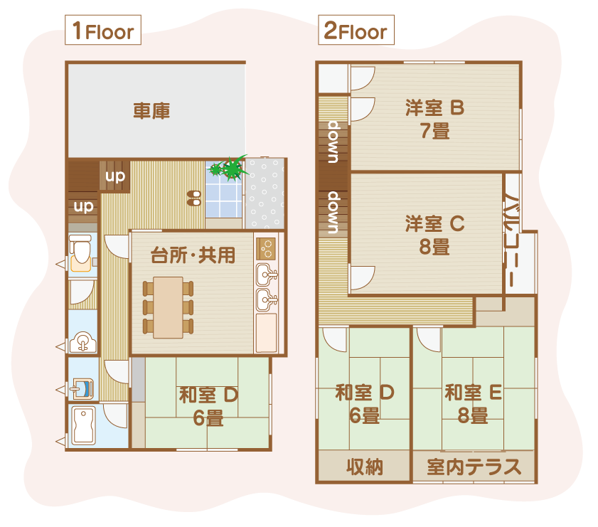 ● 居室5室、交流室、リビング、キッチン、洗面所、浴室、トイレ
